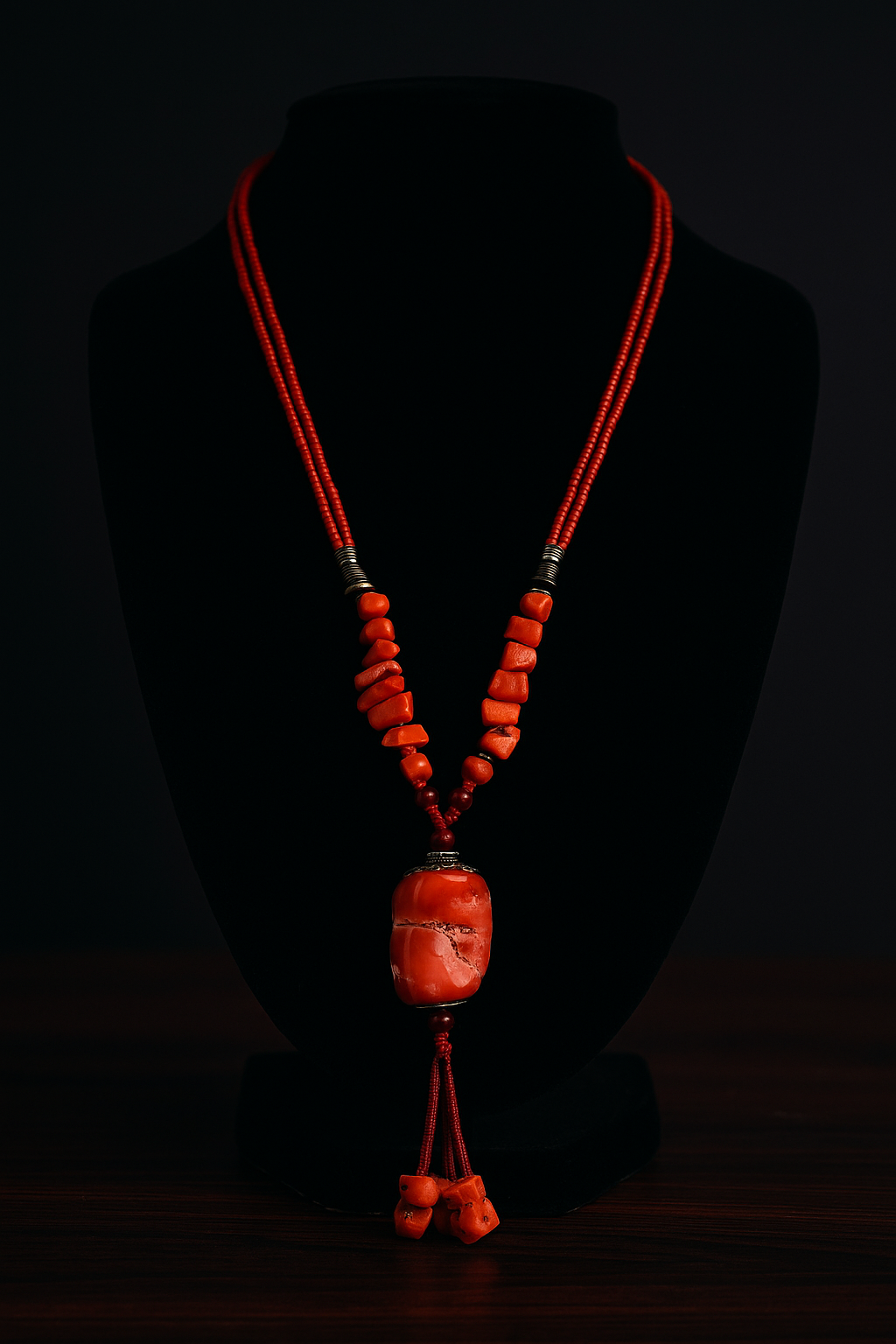 This exquisite necklace is a statement piece crafted with vibrant red coral stones that radiate natural beauty and elegance. The design combines smooth beads with uniquely shaped natural coral chunks, showcasing their organic texture and deep, rich color. At the center, a larger polished coral stone becomes the focal point, exuding a bold yet refined charm. Hanging tassel-like strands finished with coral pieces add movement and artistic detail, making the necklace both striking and graceful.